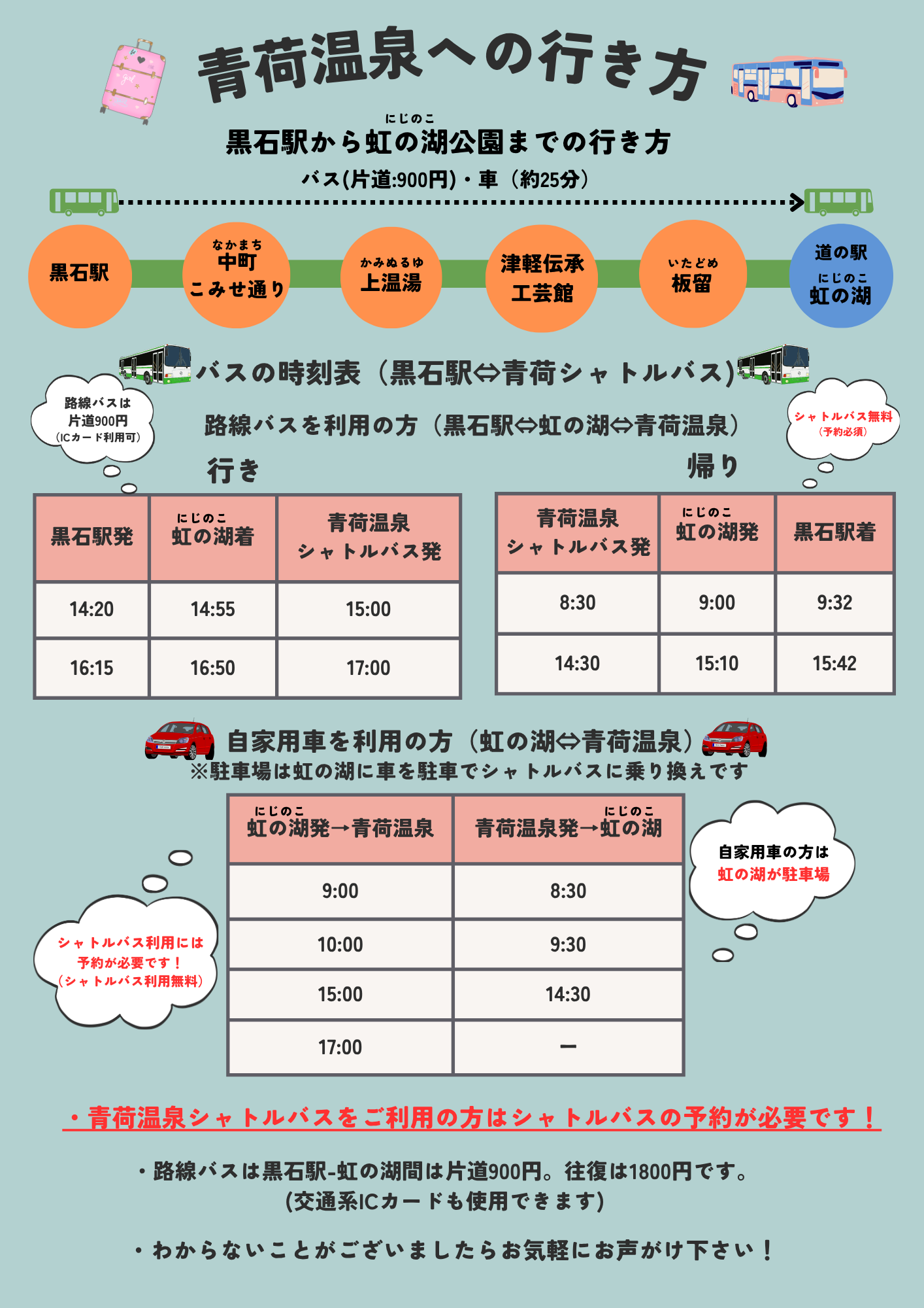 | 令和5年4月弘南バスダイヤ改正によりシャトルバスの時刻・発着場所が変更となります。青荷温泉ホームページからご確認ください。 | |